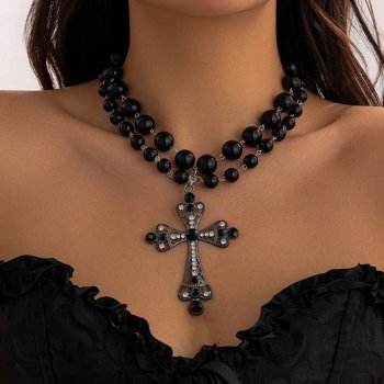 Multilayer Goth Cross Pendant Choker Necklace with Rhinestones for Women